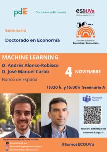 Dentro de las Actividades Formativas del Programa de Doctorado en Economía el martes 4 de noviembre a las 13 horas y a las 16 horas, en el Seminario A de la Facultad de Ciencias Económicas y Empresariales, D. Andrés Alonso-Robisco y D. José Manuel Carbo (Banco de España), impartirán el seminario: "Machine Learning".